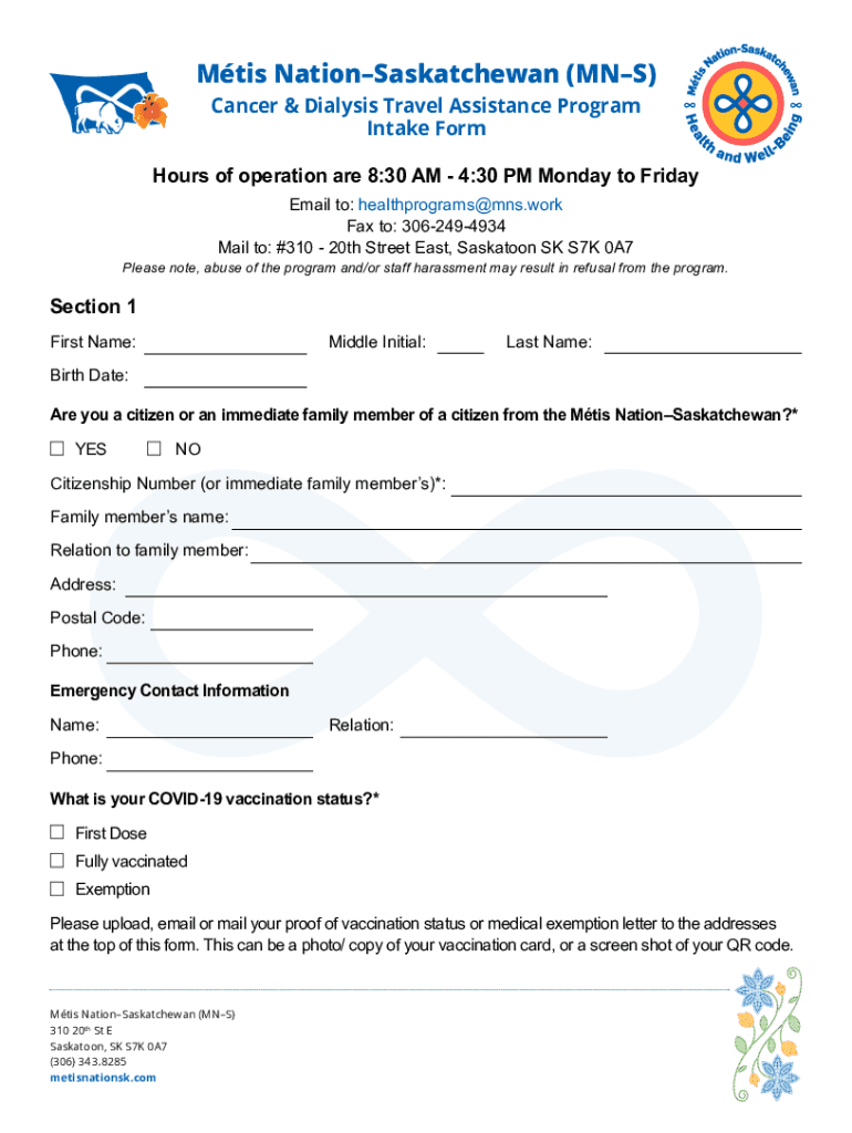 Otis Nation Saskatchewan (MNS) Cancer & Dialysis Travel Assistance Program Intake Form Hours of operation are 8:30 AM 4:30 PM Monday to Friday Email to: health programs×MNS.work Fax to: 3062494934