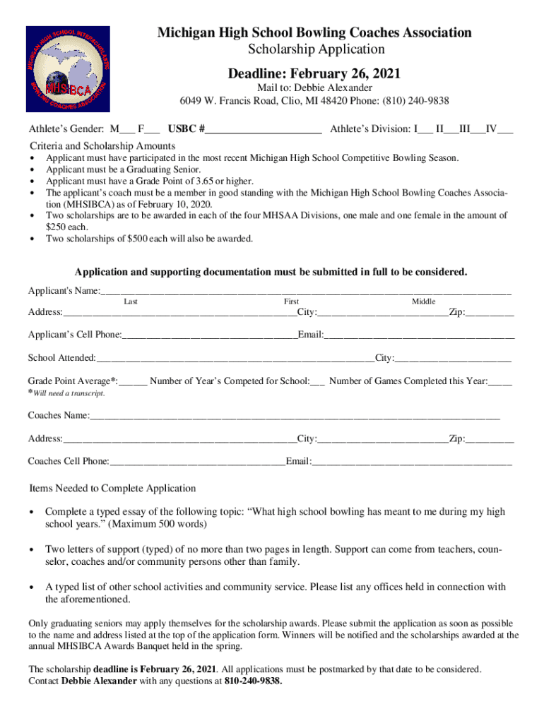 Michigan High School Bowling Coaches Association Scholarship Application Deadline: February 26, 2021, Mail to: Debbie Alexander 6049 W. Francis Road, Clio, MI 48420 Phone: (810× 2409838 Athletes