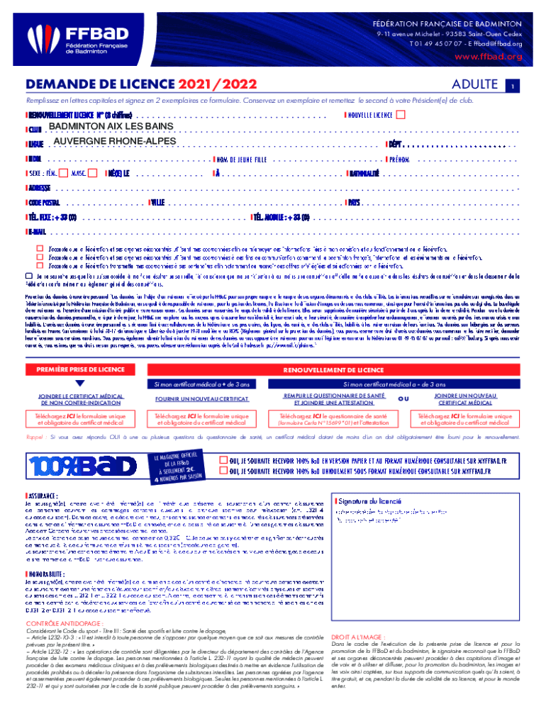 FORMATION FRANCHISE DE BADMINTON 911 avenue Michele 93583 Sainted CEDEX T 01 49 45 07 07 E ff bad×ff bad.organ.ff bad.on-demand DE License 2021×2022ADULTE1Remplissez en letters capital set signed