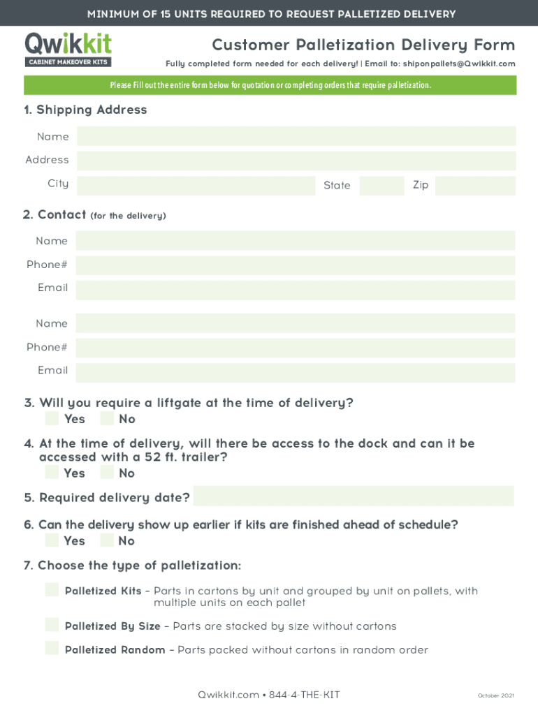 MINIMUM OF 15 UNITS REQUIRED TO REQUEST PALLETIZED DELIVERYCustomer Palletization Delivery Form Fully completed form needed for each delivery! | Email to: shiponpallets×Wicket.complete Fill out the