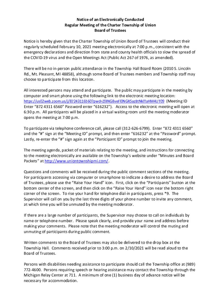 Notice of an Electronically Conducted Regular Meeting of the Charter Township of Union Board of Trustees Notice is hereby given that the Charter Township of Union Board of Trustees will conduct their
