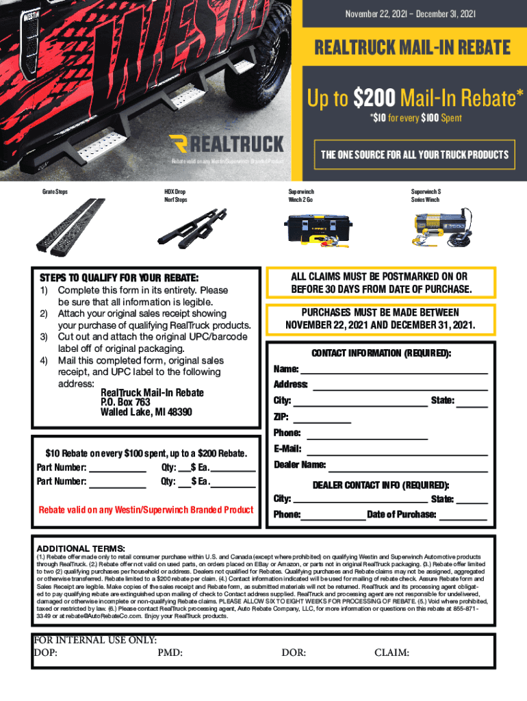 November 22, 2021, December 31, 2021REALTRUCK MAILING Rebate to $200 Mailing Rebate* *$10 for every $100 Spent ONE SOURCE FOR ALL YOUR TRUCK PRODUCTSRebate valid on any Weston×Super winch Branded