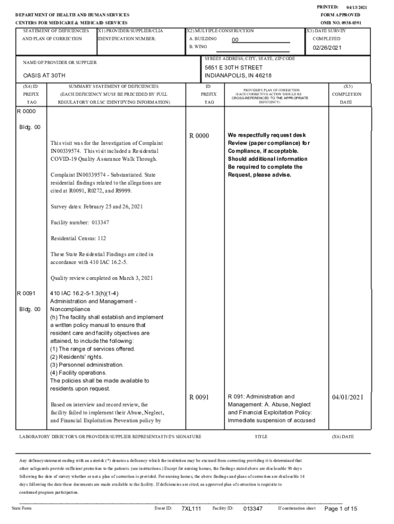 PRINTED: DEPARTMENT OF HEALTH AND HUMAN SERVICES CENTERS FOR MEDICARE & MEDICAID SERVICES STATEMENT OF DEFICIENCIES×X1) PROVIDER×SUPPLIER×LIGAND PLAN OF CORRECTIONIDENTIFICATION NUMBER:04×13/2021FORM