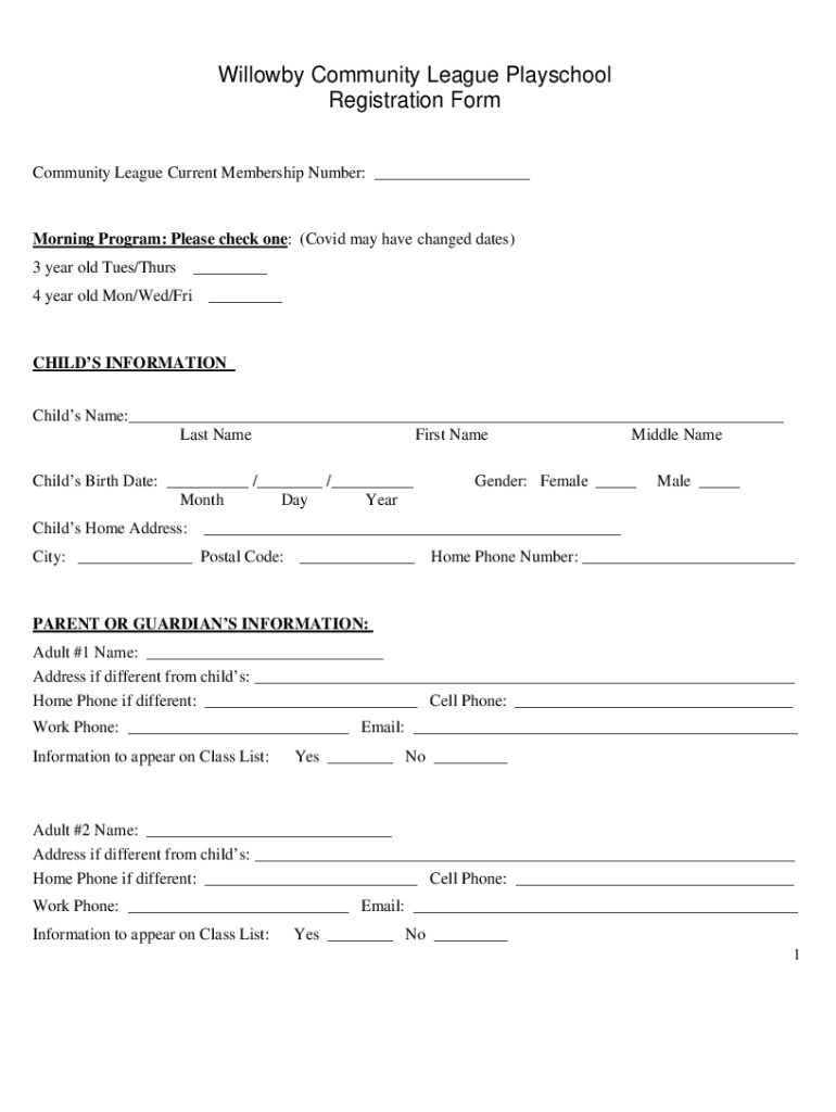 Willowy Community League Playschool Registration Form Community League Current Membership Number: ___Morning Program: Please check one: (COVID-19 may have changed dates) 3-year-old Tues×Thurs 4-year-old