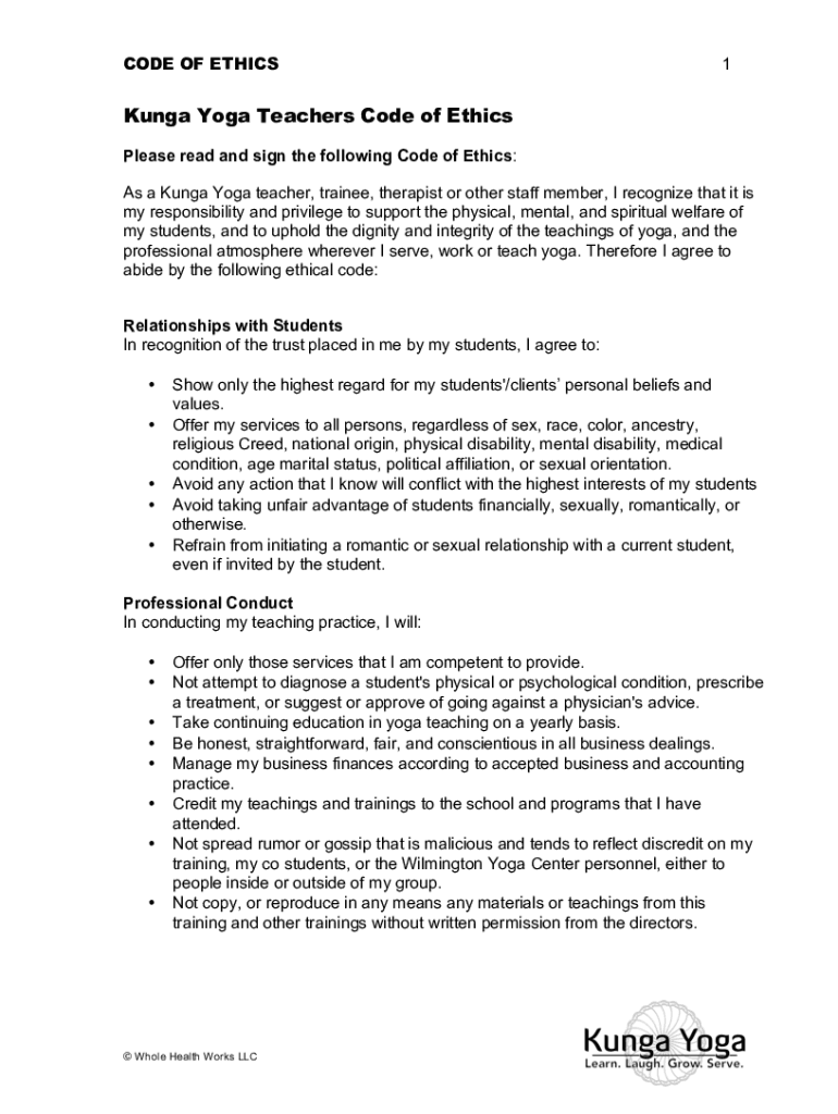 CODE OF ETHICS1Kunga Yoga Teachers Code of Ethics Please read and sign the following Code of Ethics: As a King Yoga teacher, trainee, therapist or other staff member, I recognize that it is my responsibility