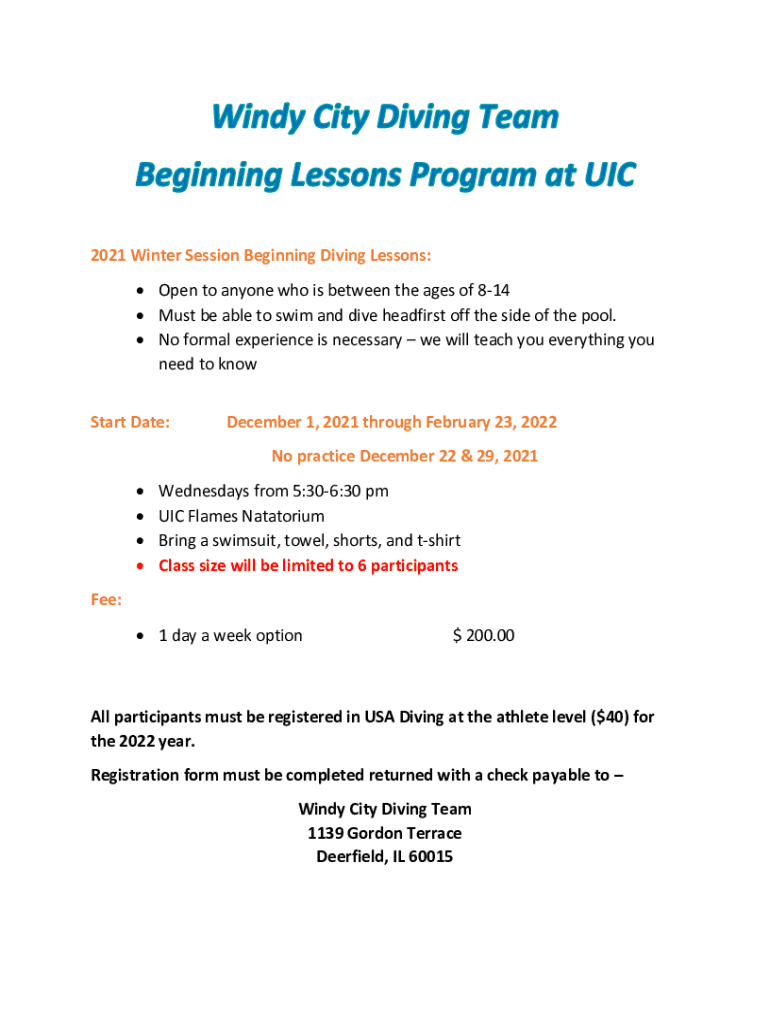 2021 Winter Session Beginning Diving Lessons: Open to anyone who is between the ages of 814 Must be able to swim and dive headfirst off the side of the pool. No formal experience is necessary we will