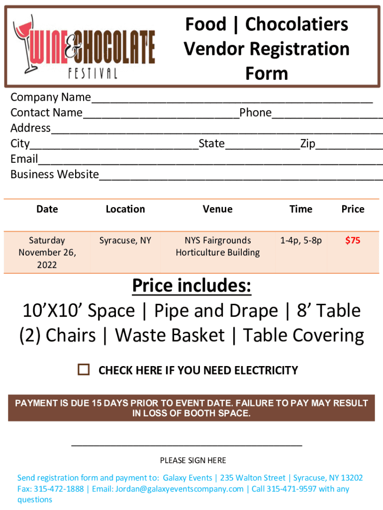 Food | Chocolates Vendor Registration FormCompany Name___ Contact Name___Phone___ Address___ City___State___Zip___ Email___ Business Website___ DateLocationVenueTimePriceSaturday November 26, 2022Syracuse,