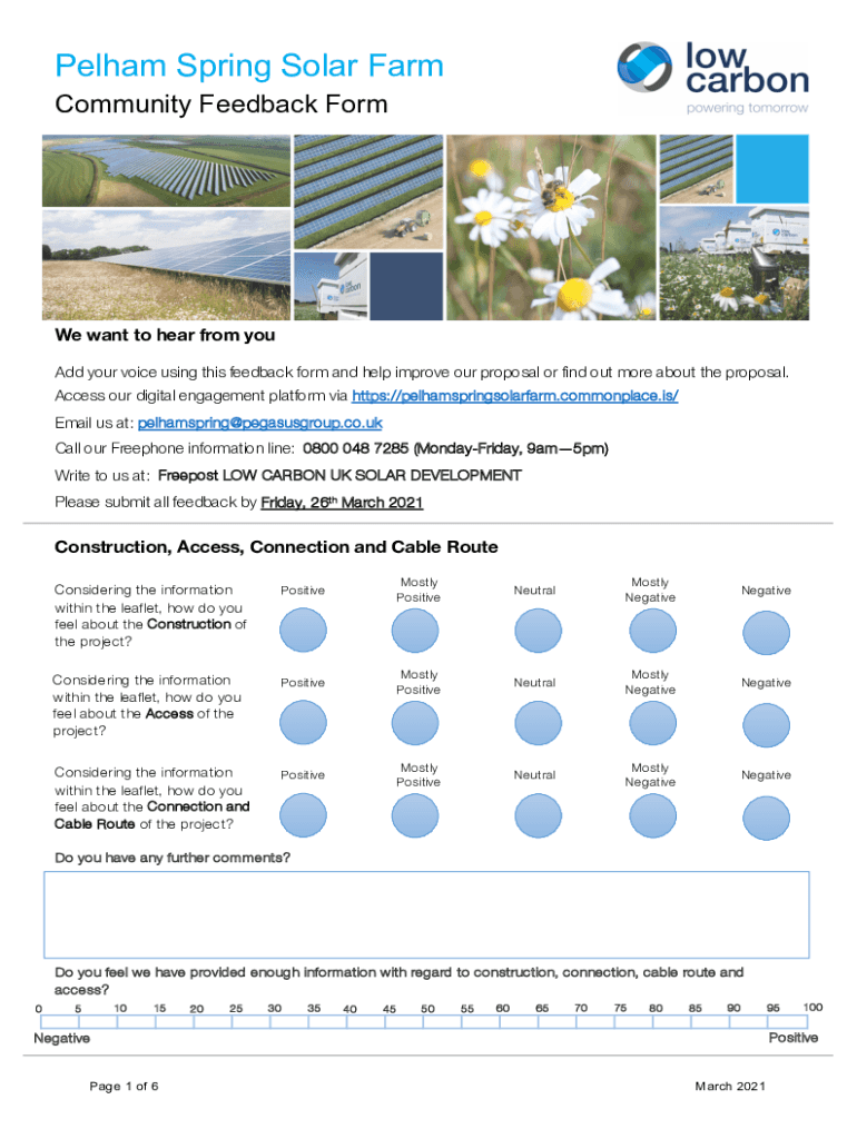 Pelham Spring Solar Farm Community Feedback Form want to hear from you Add your voice using this feedback form and help improve our proposal or find out more about the proposal. Access our digital
