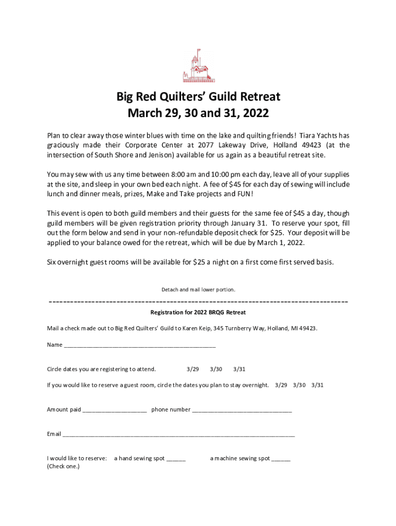 Big Red Quilters Guild Retreat March 29, 30 and 31, 2022 Plan to clear away those winter blues with time on the lake and quilting friends! Tiara Yachts has graciously made their Corporate Center at