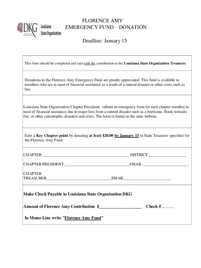 FLORENCE AMY EMERGENCY FUND DONATION Deadline: January 15This form should be completed and sent with the contribution to the Louisiana State Organization Treasurer. Donations to the Florence Amy Emergency