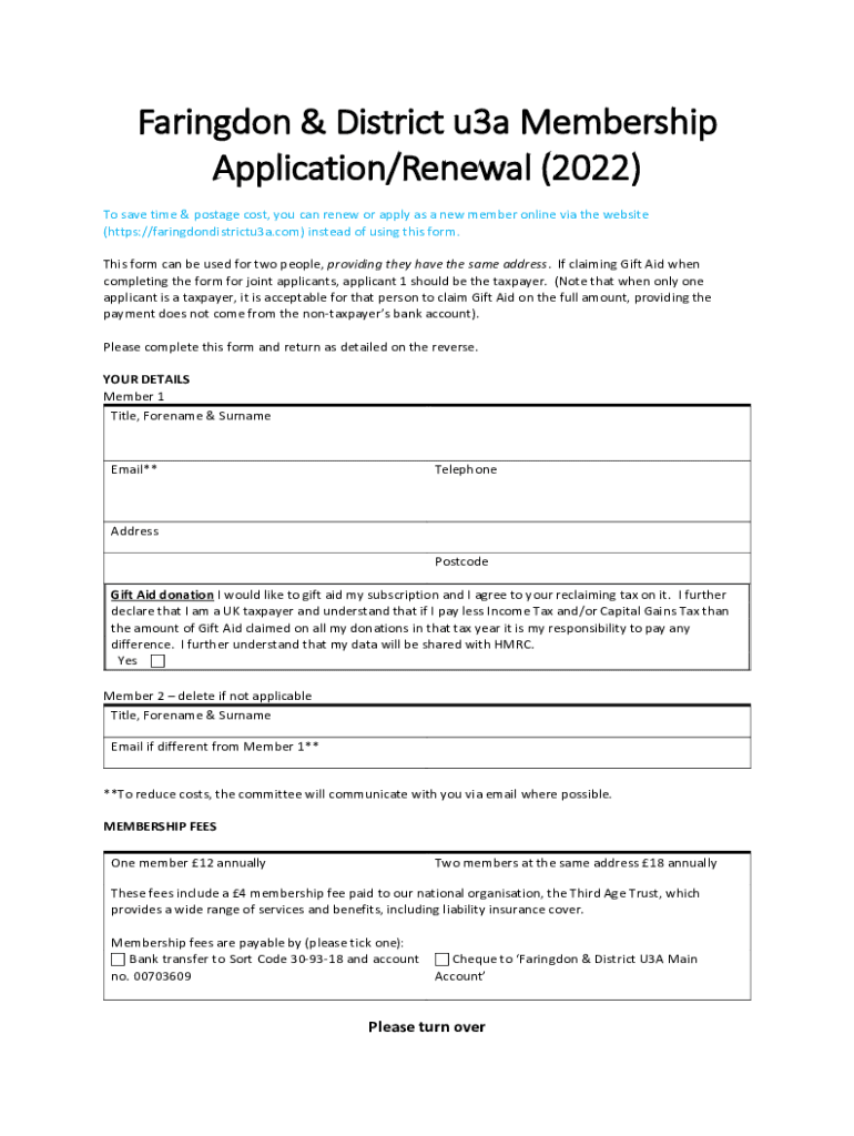 Get the free Faringdon & District u3a Membership Application/Renewal (2022)