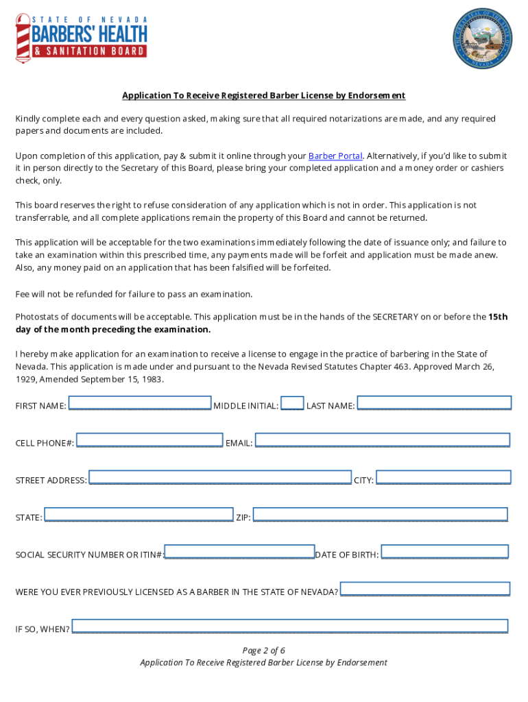 Application To Receive Registered Barber License By Endorsement Pay & Submit Online through your Barber Portal HTTPS://barber.NV.requirements for Registered Barber License by Endorsement: Please be