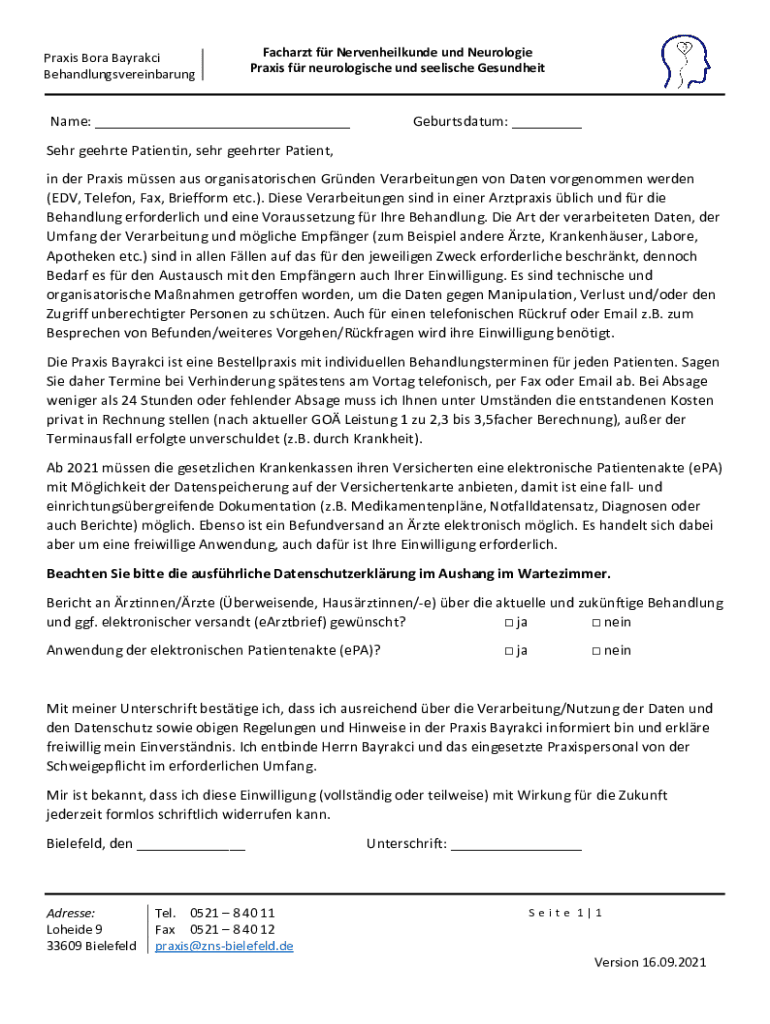 Praxis Born Barracks BehandlungsvereinbarungFacharzt for Nervenheilkunde UND Neurologic Praxis for neurological UND seelische GesundheitName: ___Geburtsdatum: ___Seer George Patient in, seer greater