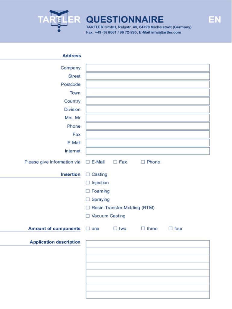TARTER QUESTIONNAIREENTARTLER GmbH, Relist. 48, 64720 Michelstadt (Germany) Fax: +49 ×0× 6061 × 96 72295, Email info×tarter.address Company Street Postcode Town Country Division Mrs, Mr Phone