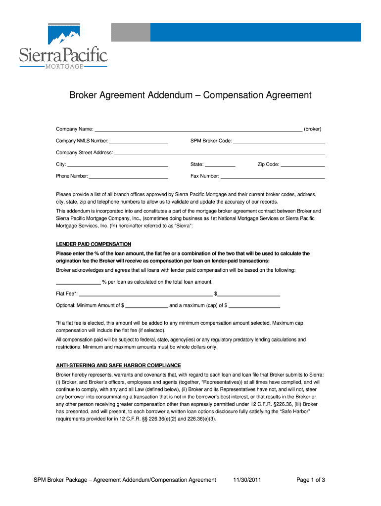 Broker Agreement Addendum Compensation Agreement (broker) Company Name: SPM Broker Code: Company NLS Number: Company Street Address: City: State: Zip Code: Phone Number: Fax Number: Please provide