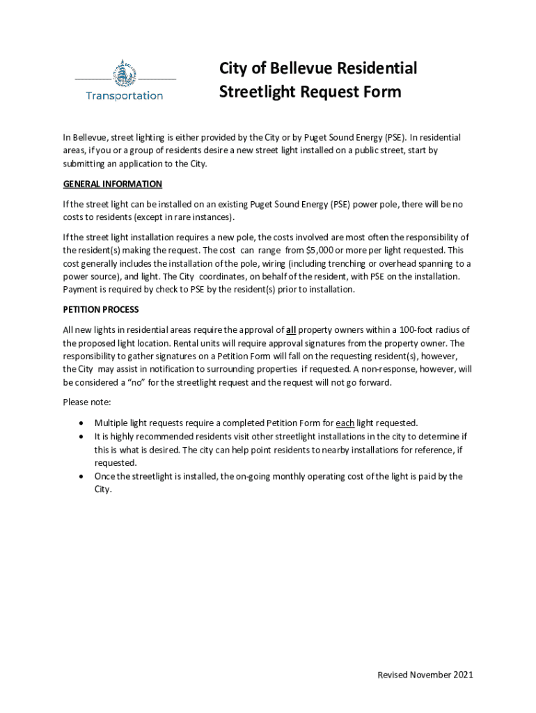 City of Bellevue Residential Streetlight Request Form In Bellevue, street lighting is either provided by the City or by Puget Sound Energy (PSE×. In residential areas, if you or a group of residents