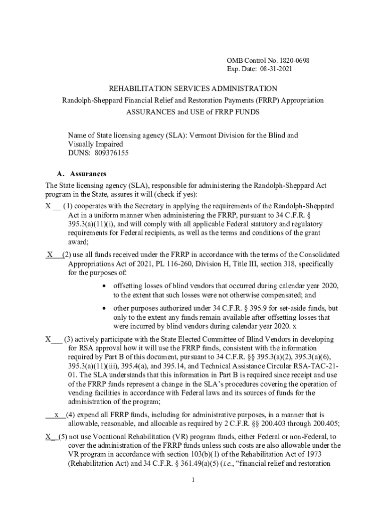 OMB Control No. 18200698 Exp. Date: 08312021REHABILITATION SERVICES ADMINISTRATION Randolph Sheppard Financial Relief and Restoration Payments (FRP) Appropriation ASSURANCES and USE of FRP FUNDS Name