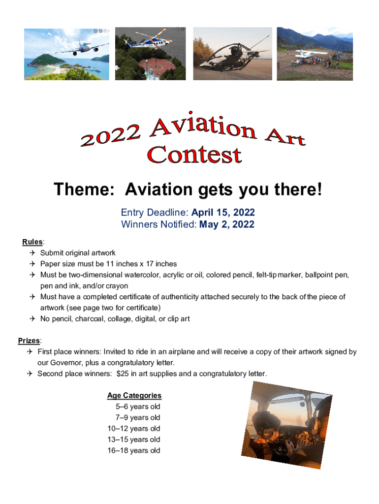 Theme: Aviation gets you there! Entry Deadline: April 15, 2022, Winners Notified: May 2, 2022, Rules: Submit original artwork Paper size must be 11 inches x 17 inches Must be two-dimensional watercolor,