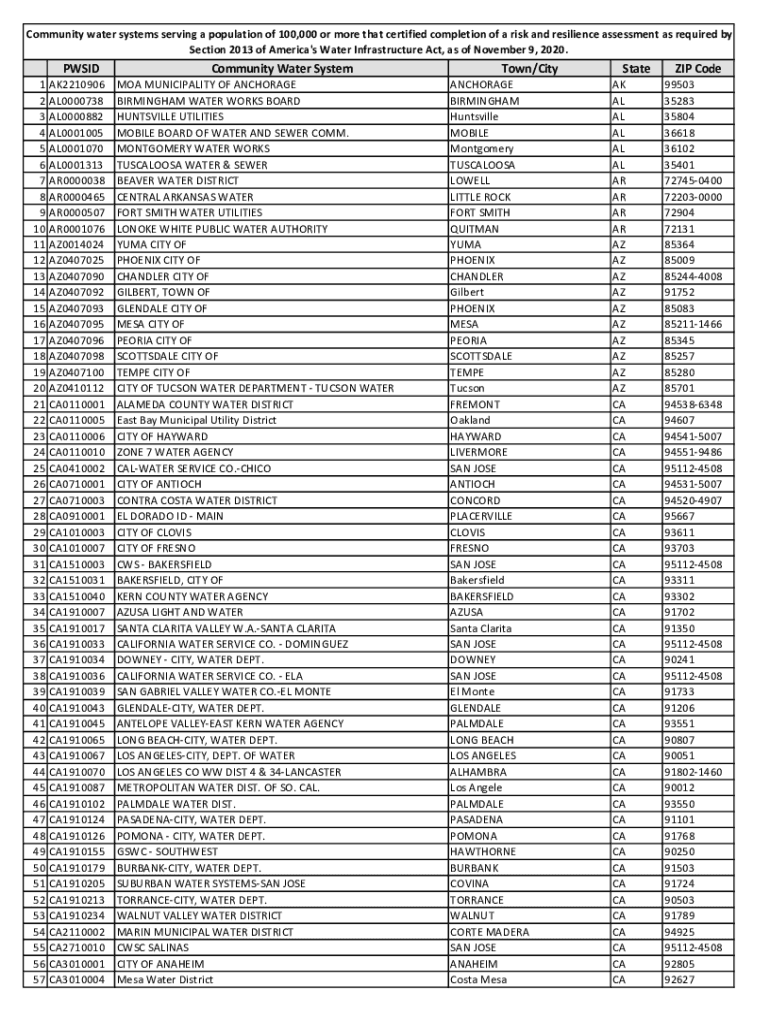 Communitywatersystemsservingapopulationof100,000ormorethatcertifiedcompletionofariskandresilienceassessmentasrequiredby Section2013ofAmerica\'sWaterInfrastructureAct,asofNovember9,2020.PW SID 1 2