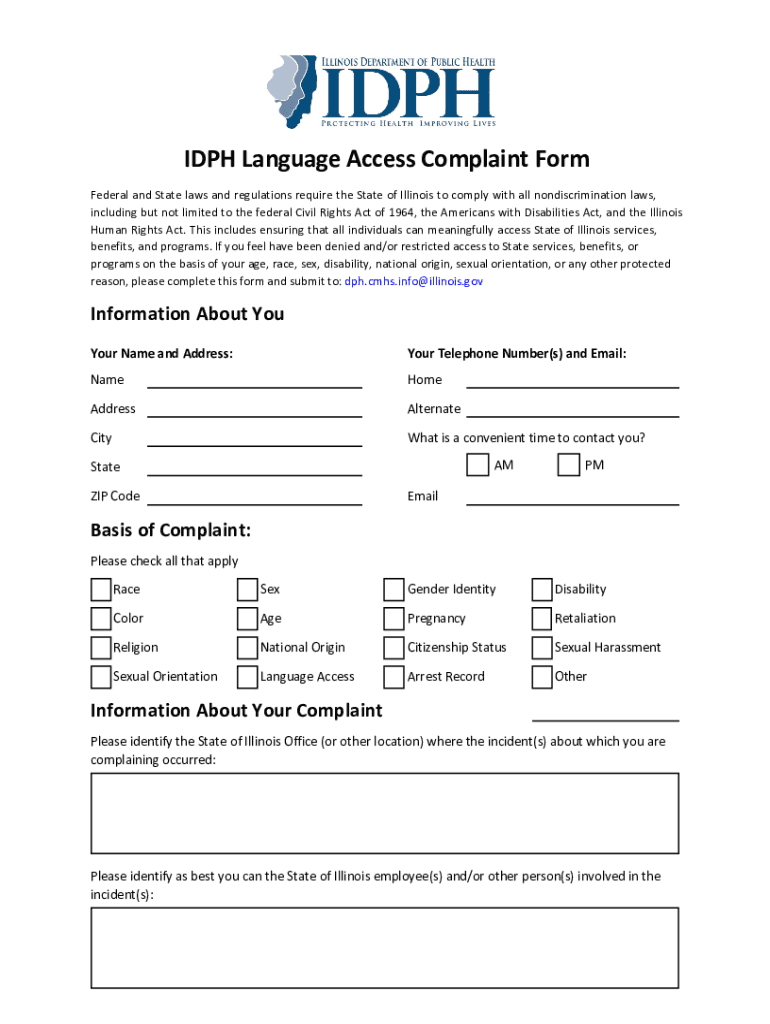 DPH Language Access Complaint Form Federal and State laws and regulations require the State of Illinois to comply with all nondiscrimination laws, including but not limited to the federal Civil Rights