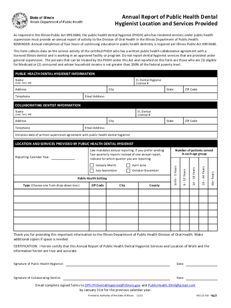 Annual Report of Public Health Dental Hygienist Location and Services Provided As required in the Illinois Public Act 0990680, the public health dental hygienist (PhD) who has rendered services under
