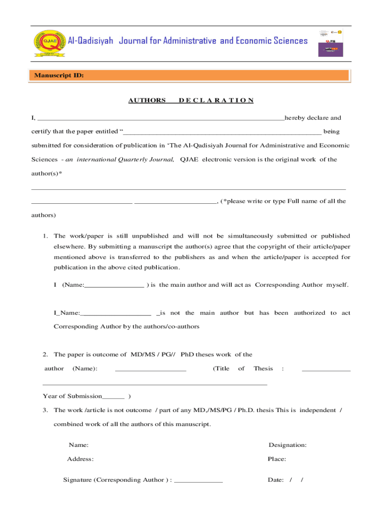 Manuscript ID:AUTHORSDECLARATIONI, ___hereby declare and certify that the paper entitled ___ being submitted for consideration of publication in The AlQadisiyah Journal for Administrative and Economic