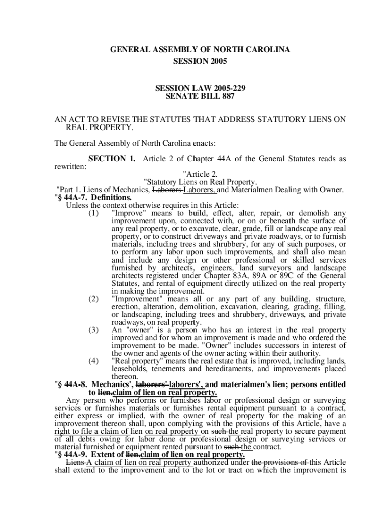 GENERAL ASSEMBLY OF NORTH CAROLINA SESSION 2005 SESSION LAW 2005229 SENATE BILL 887 AN ACT TO REVISE THE STATUTES THAT ADDRESS STATUTORY LIENS ON REAL PROPERTY. The General Assembly of North Carolina