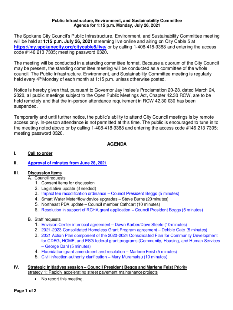 Public Infrastructure, Environment, and Sustainability Committee Agenda for 1:15 p.m. Monday, July 26, 2021The Spokane City Councils Public Infrastructure, Environment, and Sustainability Committee