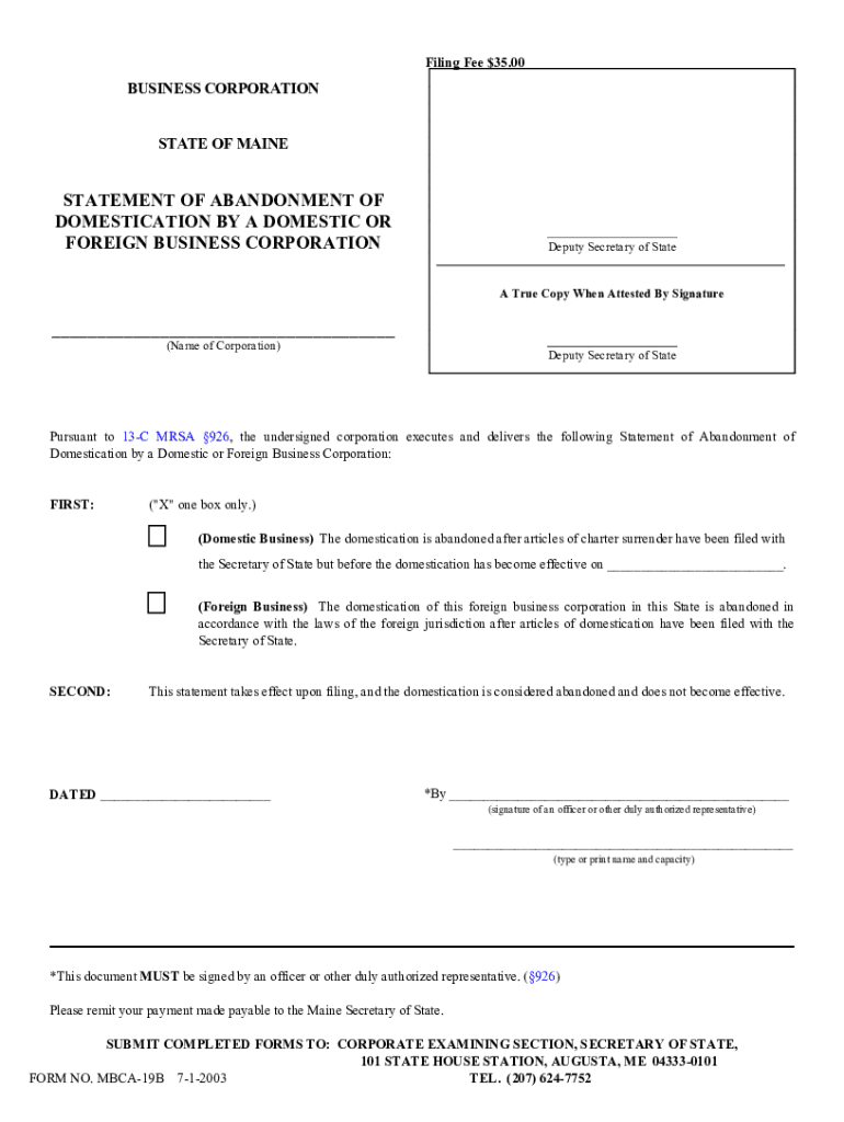 Filing Fee $35.00BUSINESS CORPORATION STATE OF REINSTATEMENT OF ABANDONMENT OF DOMESTICATION BY A DOMESTIC OR FOREIGN BUSINESS CORPORATION___ Deputy Secretary of State True Copy When Attested By Signature______