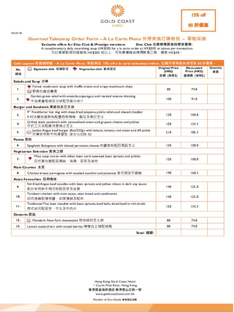 20220106Gourmet Takeaway Order Form À la carte Menu Exclusive offers for Sing Club & prestige members Sing Club : A complimentary daily nourishing soup (HK×38) for à la carte order at HK×300 or