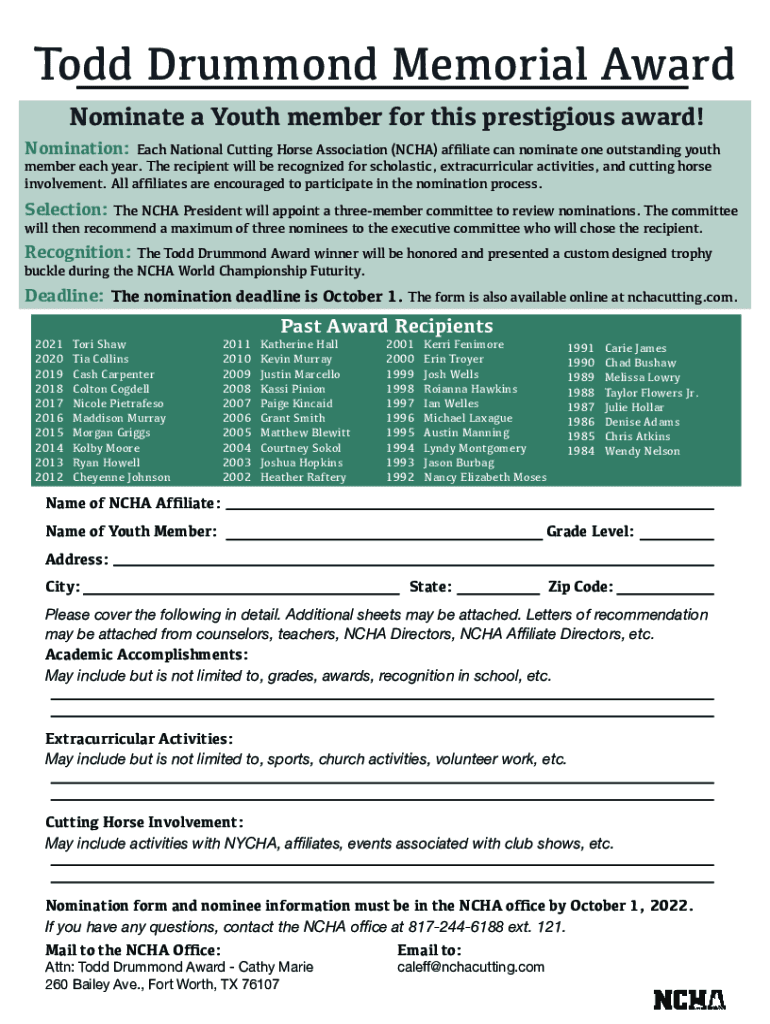 Todd Drummond Memorial Award Nominate a Youth member for this prestigious award! Nomination:Each National Cutting Horse Association (NCAA) affiliate can nominate one outstanding youth member each