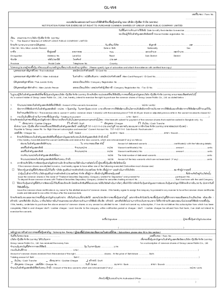 GLW4 / Form No. ...... () NOTIFICATION FORM FOR EXERCISE OF RIGHT TO PURCHASE COMMON SHARES OF GROUP LEASE PUBLIC COMPANY LIMITED