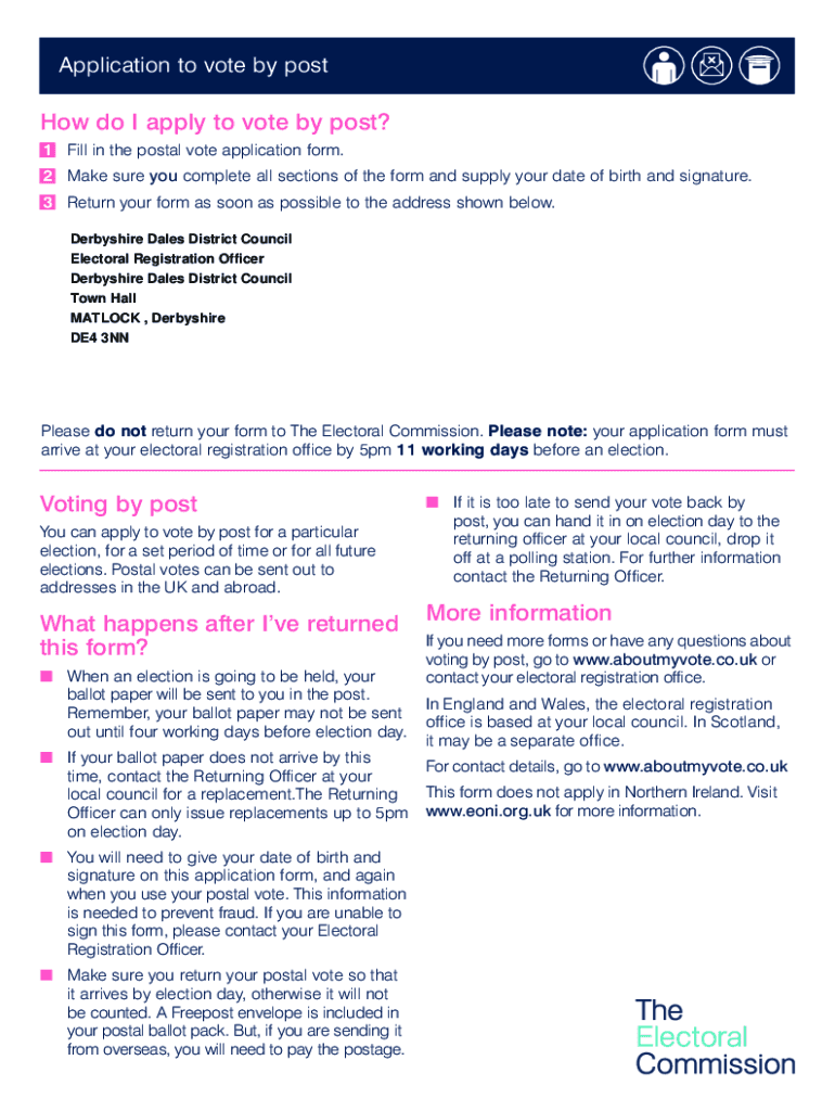 Application to vote by postdoc do I apply to vote by post? 1 Fill in the postal vote application form. 2 Make sure you complete all sections of the form and supply your date of birth and signature.