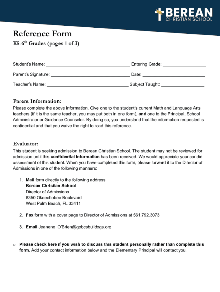 Reference Form K56th Grades (pages 1 of 3) Students Name: ___ Entering Grade: ___ Parents Signature: ___ Date: ___ Teachers Name: ___ Subject Taught: ___Parent Information: Please complete the above