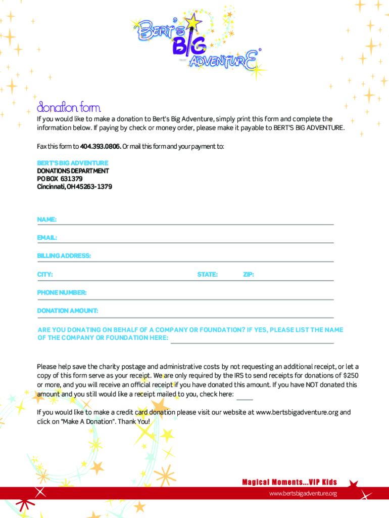 Donation Formic you would like to make a donation to Bert's Big Adventure, simply print this form and complete the information below. If paying by check or money order, please make it payable to BEATS