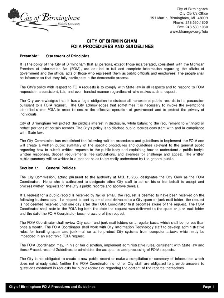 City of Birmingham City Clerks Office 151 Martin, Birmingham, MI 48009 Phone: 248.530.1800 Fax: 248.530.1080 www.bhamgov.org×opacity OF BIRMINGHAM FOIA PROCEDURES AND GUIDELINES Preamble:Statement