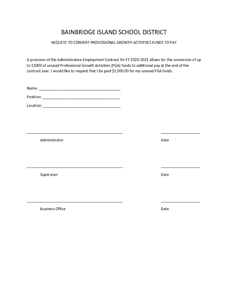 BAINBRIDGE ISLAND SCHOOL DISTRICT REQUEST TO CONVERT PROFESSIONAL GROWTH ACTIVITIES FUNDS TO PAY provision of the Administrative Employment Contract for FY 20202021 allows for the conversion of up
