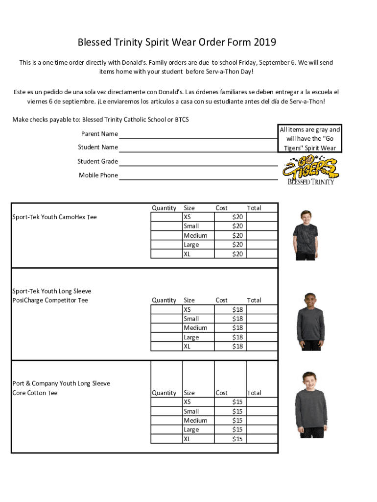 Blessed Trinity Spirit Wear Order Form 2019 This is a one time order directly with Donald\'s. Family orders are due to school Friday, September 6. We will send items home with your student before