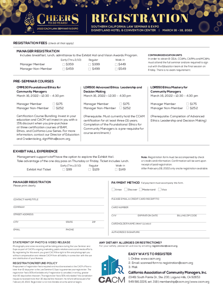 REGISTRATION SOUTHERN CALIFORNIA LAW SEMINAR & EXPO DISNEYLAND HOTEL & CONVENTION CENTER |REGISTRATION RESEARCH 16 18, 2022×check all that apply×MANAGER REGISTRATIONIncludes breakfast, lunch, admittance