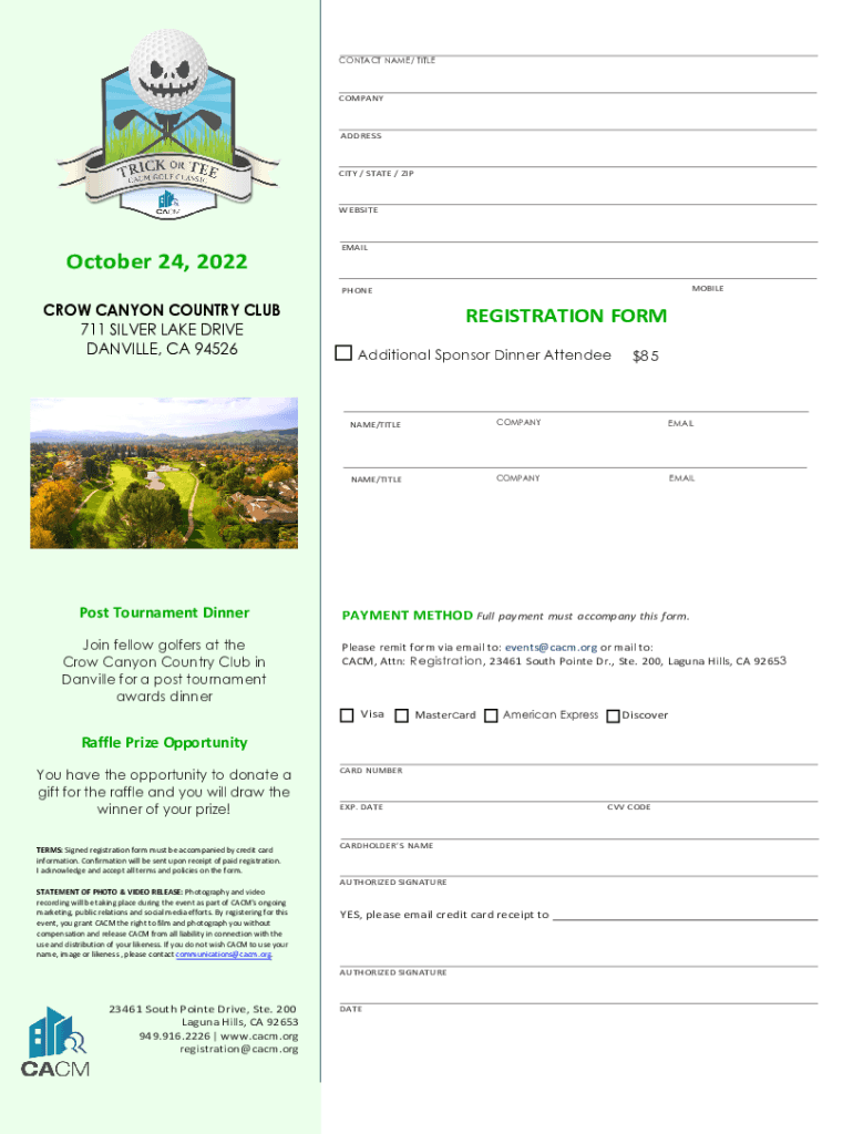 CONTACT NAME/ TITLECOMPANYADDRESSCITY / STATE / ZIPWEBSITEOctober 24, 2022EMAILMOBILEPHONECROW CANYON COUNTRY CLUB 711 SILVER LAKE DRIVE DANVILLE, CA 94526Post Tournament Dinner Join fellow golfers