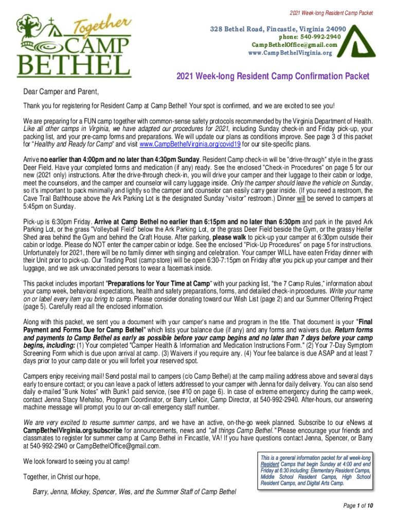2021 Weeklong Resident Camp Packet328 Ethel Road, Fin castle, Virginia 24090 phone: 5409922940 CampBethelOffice×gmail.com www.CampBethelVirginia.org2021 Weeklong Resident Camp Confirmation Packet