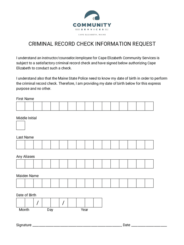 CRIMINAL RECORD CHECK INFORMATION REQUEST I understand an instructor×counselor×employee for Cape Elizabeth Community Services is subject to a satisfactory criminal record check and have signed below