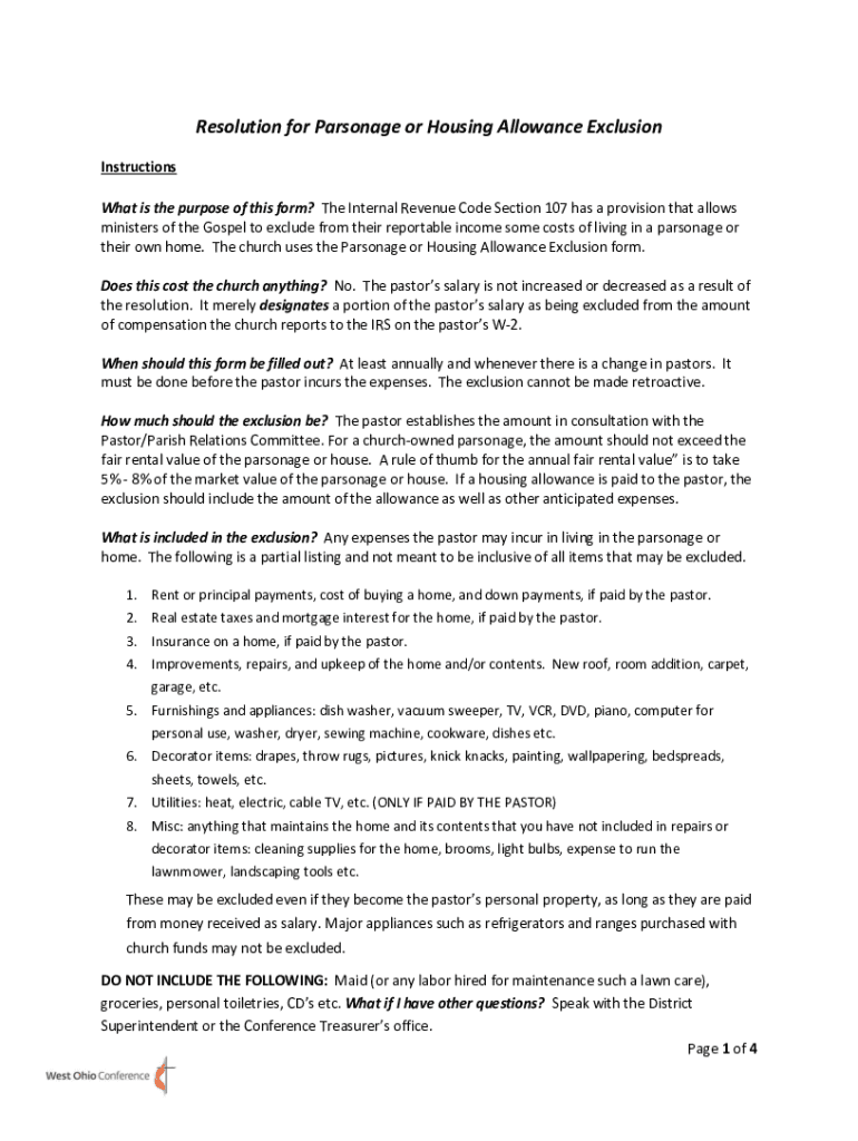 Resolution for Parsonage or Housing Allowance Exclusion Instructions What is the purpose of this form? The Internal Revenue Code Section 107 has a provision that allows ministers of the Gospel to