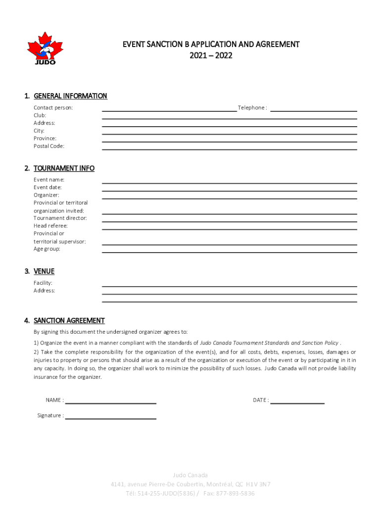 EVENT SANCTION B APPLICATION AND AGREEMENT 2021 20221. GENERAL INFORMATION Contact person: Club: Address: City: Province: Postal Code:Telephone :2. TOURNAMENT INFO Event name: Event date: Organizer: