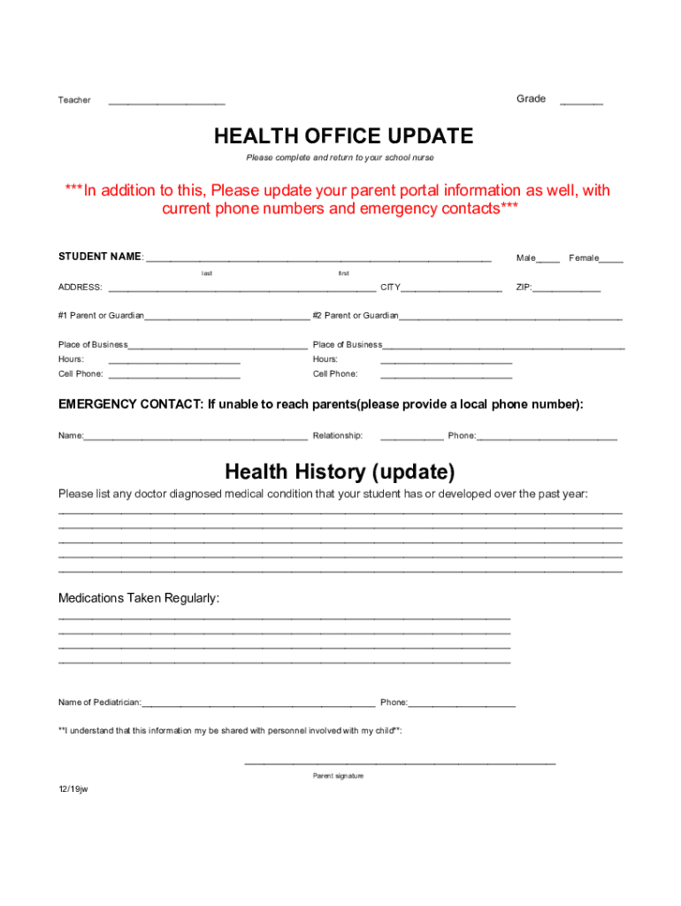 TeacherGrade______HEALTH OFFICE UPDATE Please complete and return to your school nurse***In addition to this, Please update your parent portal information as well, with current phone numbers and emergency