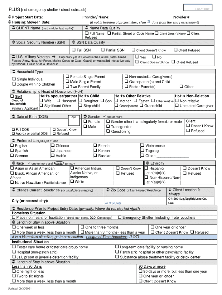 PLUS [not emergency shelter / street outreach×Client ID#: Project Start Date: ___ Provider/ Name: ___ Provider #___ Housing Move In Date: ___ (if not in housing at project start, clear date from