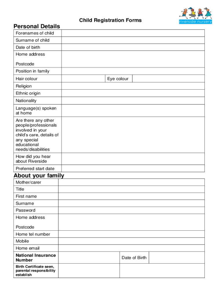 Child Registration FormsPersonal Details Forenames of child Surname of child Date of birth Home address Postcode Position in family Hair colored colourReligion Ethnic origin Nationality Language’s)