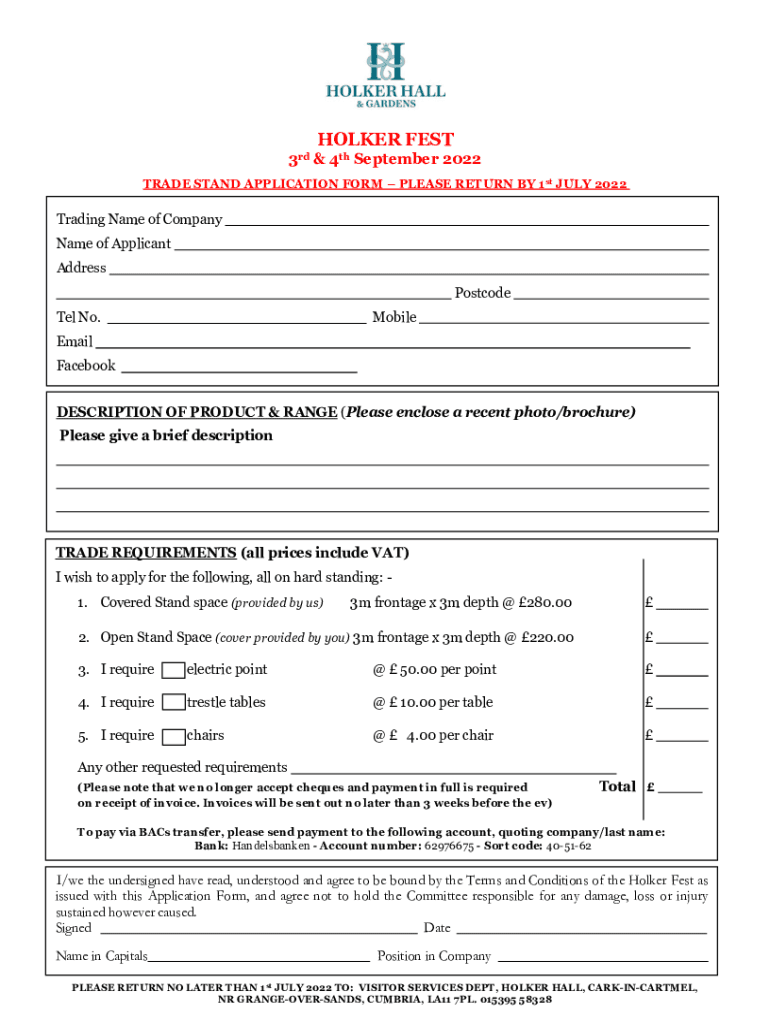 HOLDER FEST 3rd & 4th September 2022 TRADE STAND APPLICATION FORM PLEASE RETURN BY 1st JULY 2022Trading Name of Company Name of Applicant Address Postcode Tel No. MobileEmail Facebook DESCRIPTION