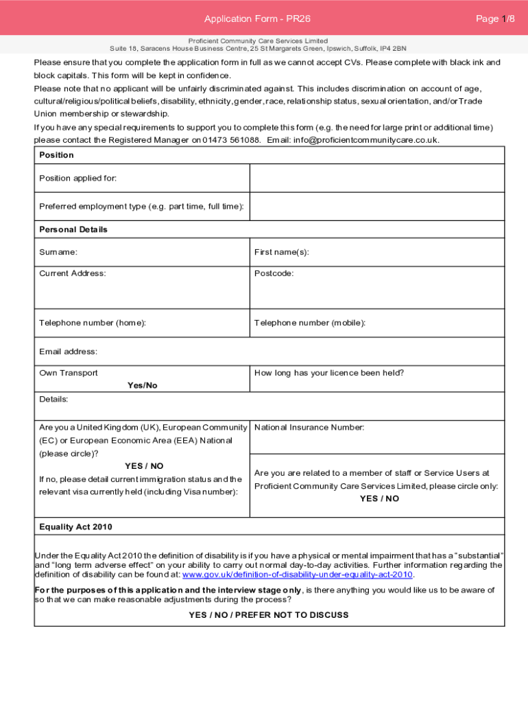 Page 1×8Application Form PR26 Proficient Community Care Services Limited Suite 18, Saracens House Business Center, 25 St Margaret's Green, Ipswich, Suffolk, IP4 2BNPlease ensure that you complete