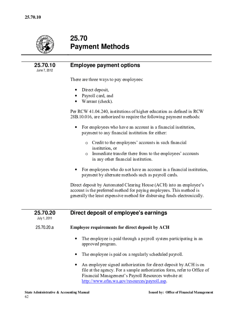 25.70.1025.70 Payment Methods 25.70.10 June 7, 2012Employee payment options There are three ways to pay employees: Direct deposit, Payroll card, and Warrant (check×. Per RCW 41.04.240, institutions